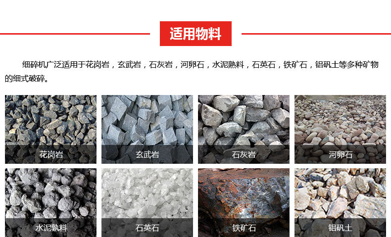 【適用物料】:花崗巖、玄武巖、石灰巖、河卵石、水泥熟料、石英石、鐵礦石、鋁礬土等多種礦物。