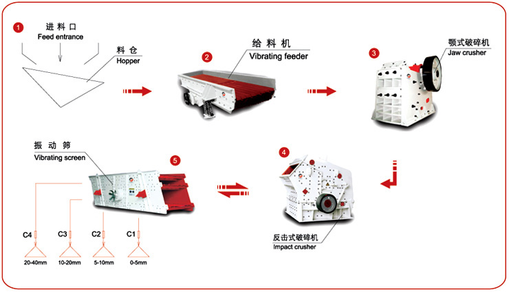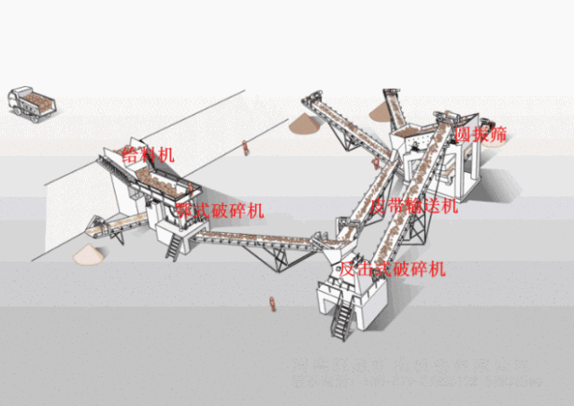 石子破碎生產線中,破碎物料硬度不超過320Mpa,如花崗巖、玄武石等,皆適用二級破碎工藝,其主要設備有:振動給料機顎式破碎機(一破)石料破碎機(二破,可為反擊式破碎機、錘式破碎機、沖擊式破碎機)振動篩成品石子,中間以皮帶輸送機傳送物料。當物料硬度不超過150Mpa時,為節約客戶成本,提高工作效率,一般采用一次成型設備,其主要設備有:振動給料機復合破碎機(即二合一破碎機,可把大塊物料通過特有的設計,一次達到理想粒度,一般為錘式破碎機)振動篩成品石子,中間以皮帶輸送機傳送物料。