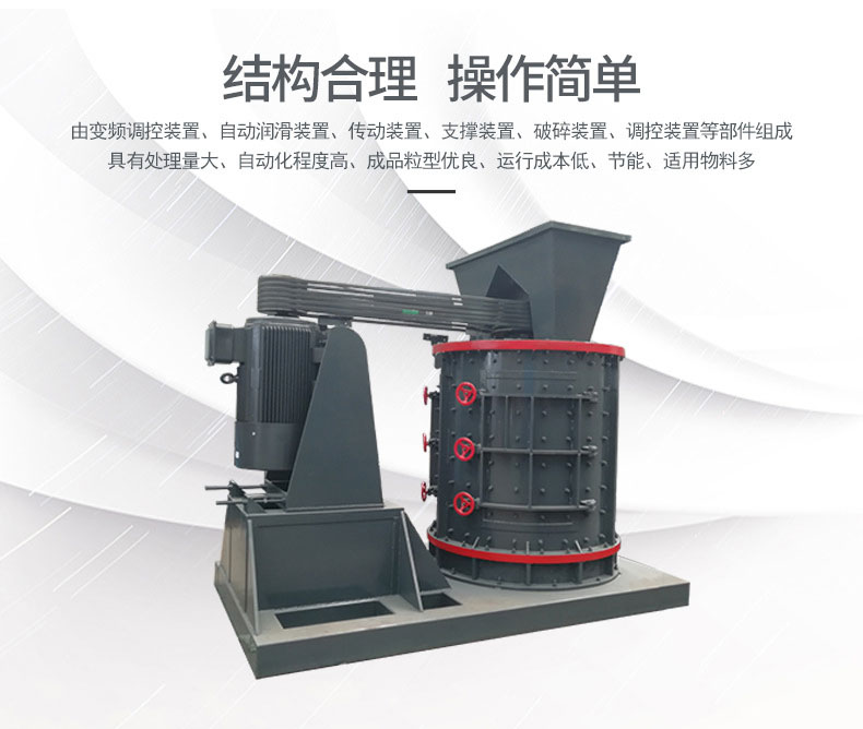 適合破碎中硬、特硬物料。物料由機器上部垂直落入高速旋轉(zhuǎn)的葉輪內(nèi),在高速離心力的作用下,與另一部分以傘狀形式分流在葉輪四周的物料產(chǎn)生高速撞擊與粉碎,物料在互相撞擊后,又會在葉輪和機殼之間以物料形成渦流多次的互相撞擊、摩擦而粉碎,從下部直通排出,形成閉路多次循環(huán),由篩分設(shè)備控制達到所要求的成品粒度。
