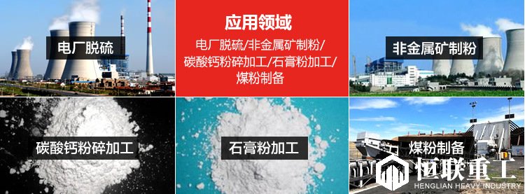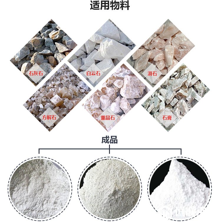 【應用范圍】:適用于重晶石、方解石、鉀長石、滑石、大理石、石灰石、陶瓷、玻璃等莫氏硬度不大于 7 級,濕度在6%以下的非易燃易爆的礦業、化工、建材、冶金等行業 280 多種物料的制粉加工,成品粒度在 100 - 425 目范圍內任意調節