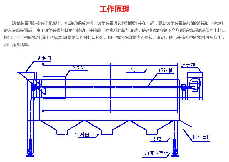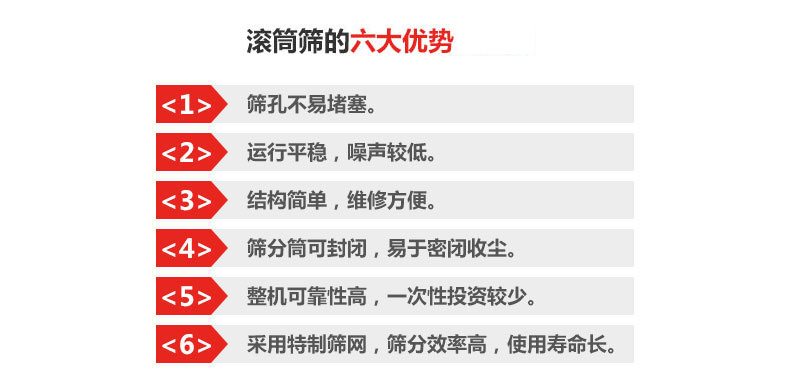 滾筒篩采用特制篩網(wǎng),篩分效率高,使用壽命長。密封性好